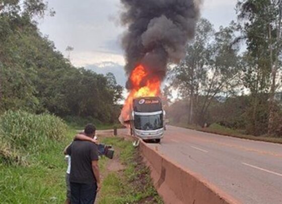 Ônibus de viagem pega fogo com 50 turistas, em Itabirito (MG)
