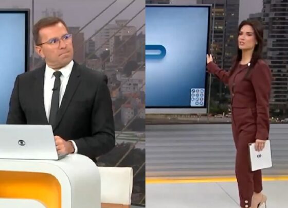 Rodrigo Bocardi e Sabina Simonato se estranham ao vivo em telejornal da Globo (Imagem: Reprodução – Globo / Montagem –…