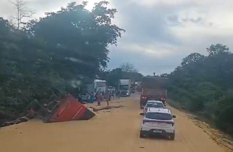 Há derramamento de carga de grão na pista e o tráfego está totalmente interditado para os procedimentos operacionais.