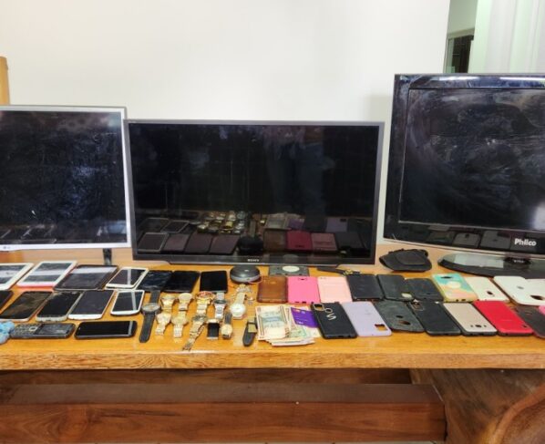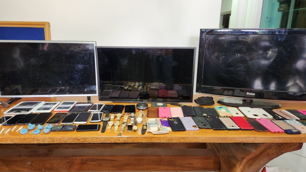 Na casa onde ele estava, os investigadores apreenderam diversos itens furtados, como três aparelhos de TV, quatro tablets, 11 relógios, 14 celulares, semijoias, entre outros, um revólver de calibre 38 carregado com cinco munições, que estava com o suspeito no momento da abordagem policial.