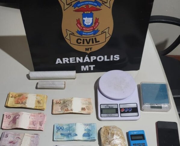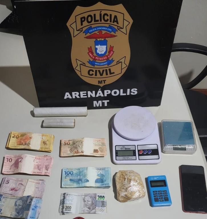 A equipe da Delegacia de Arenápolis prendeu em flagrante, no último sábado (16), um traficante de drogas conhecido na região e suspeito de distribuir entorpecentes em Arenápolis e apreendeu drogas e apetrechos usados para embalagem e pesagem.