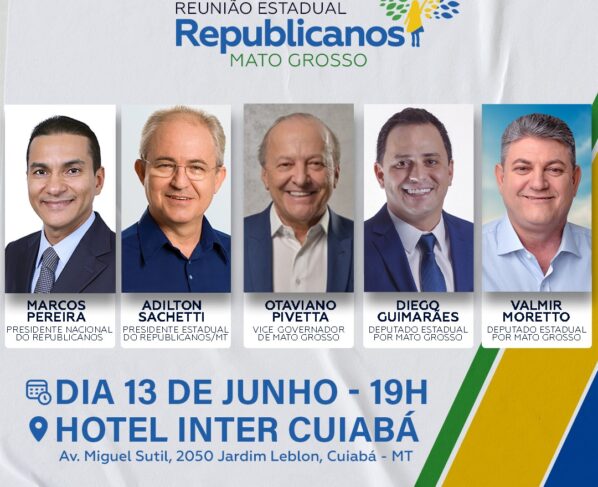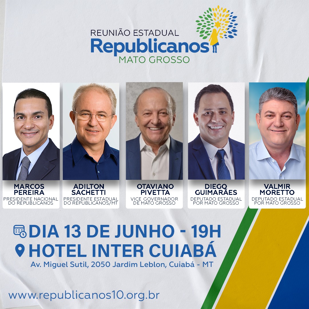 O presidente nacional do Republicanos, deputado federal Marcos Pereira, vem a Cuiabá nesta quinta-feira (13.06) para participar da reunião estadual do partido. Além dele, são presenças confirmadas no evento, marcado para ás 19 horas no Hotel Inter, o presidente estadual do partido, Adilton Sachetti, o vice-governador, Otaviano Pivetta, e os deputados estaduais, Diego Guimarães e Valmir Moretto.