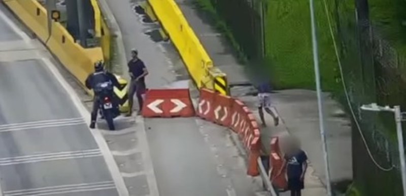 O sistema de monitoramento da rodovia flagrou toda a ação. No vídeo, é possível ver que um homem e outros dois, que aparentam ser menores de idade, estão na calçada próxima à praça de pedágio, quando um homem de moto se aproxima.